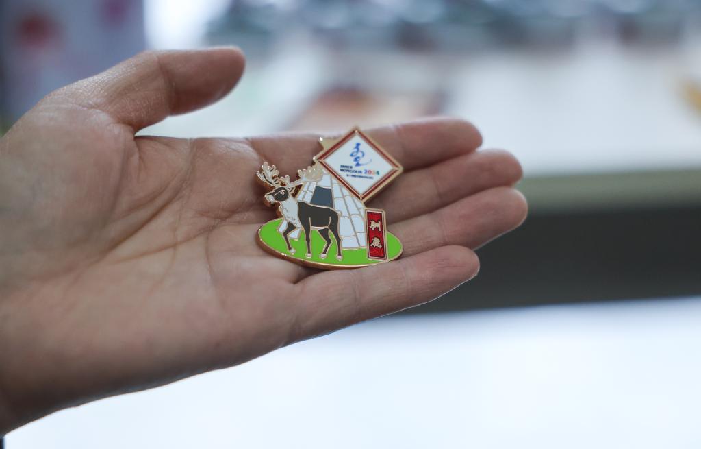 ↑1月10日拍摄的驯鹿和撮罗子主题的“十四冬”呼伦贝尔民俗徽章。新华社记者 王楷焱 摄