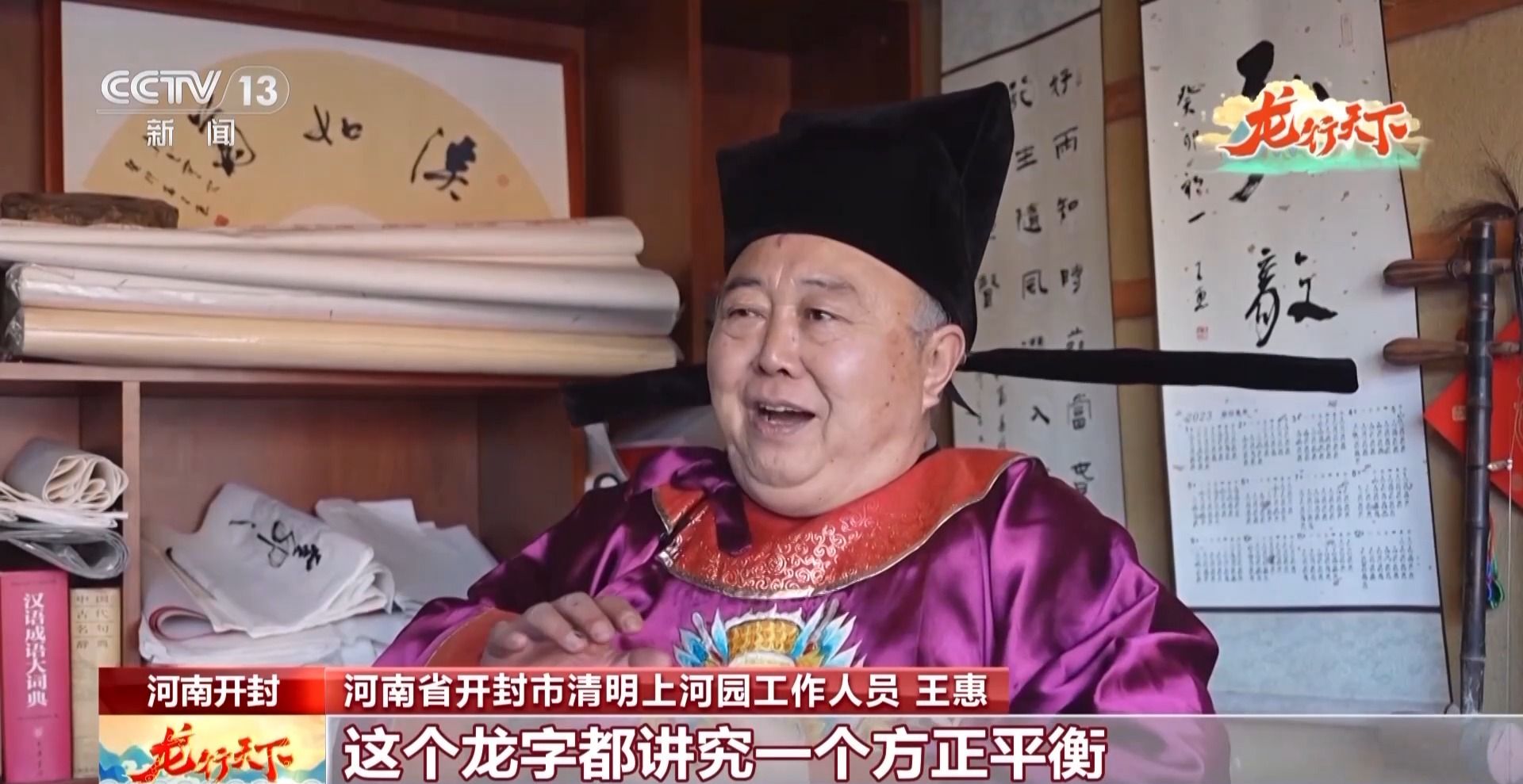 河南省开封市清明上河园工作人员 王惠:在书法中,不管是用什么方式写,这个龙字都讲究一个方正平衡。我觉得龙就是正义的化身。