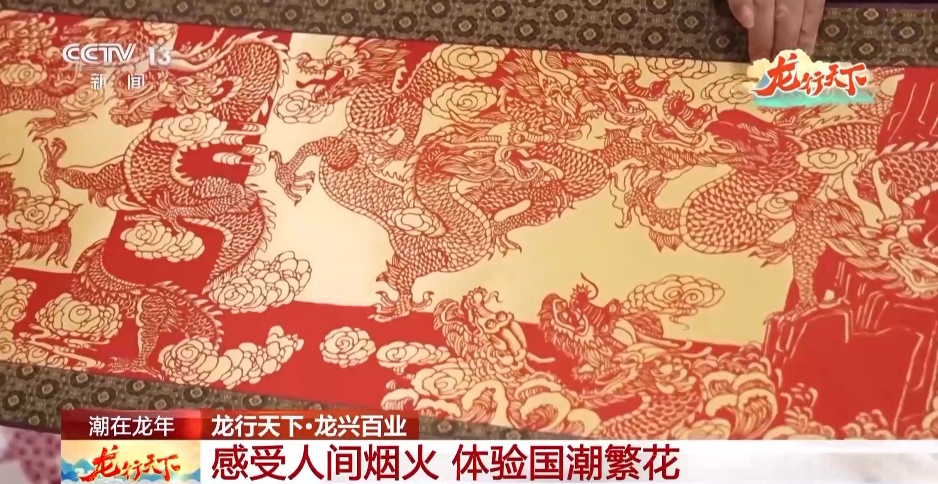 这幅长达150多米的剪纸作品《百龙图》,在当地非遗剪纸传承人胡宝国的努力下,经过一年多的创作时间,终于赶在了这个龙年春节前制作完成。在剪刀与纸的艺术碰撞下,一百条龙,形态各异,惟妙惟肖。仔细观察会发现,每条龙的眼睛都做了特别的艺术处理,通过“阳剪”与“阴剪”结合,使每条龙的眼神各具特色,表现出了一百条龙不同风格的精气神。