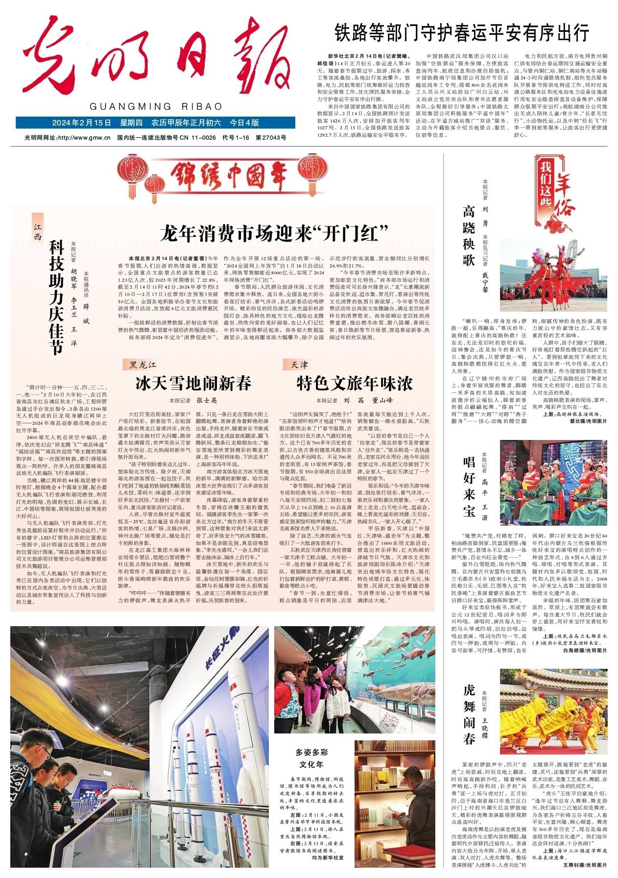 甲辰新春,天津以“中国红、天津味、盛世年”为主题,整合推出了1000余项文旅活动,营造出欢乐祥和、红火热闹的津城节日气氛。天津市文化和旅游局副局长陈冰介绍:“天津突出地域年俗文化特色,强化特色场景打造,通过多元化、体验型、沉浸式文旅场景撬动春节消费市场,让春节的喜气铺满津沽大地。”