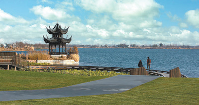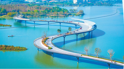 示范区加强生态环境综合治理,以太浦河、淀山湖、元荡、汾湖“一河三湖”为重点,大力推进岸线综合整治。图为横跨沪苏两地的元荡慢行桥。 上海青浦区委宣传部供图 |