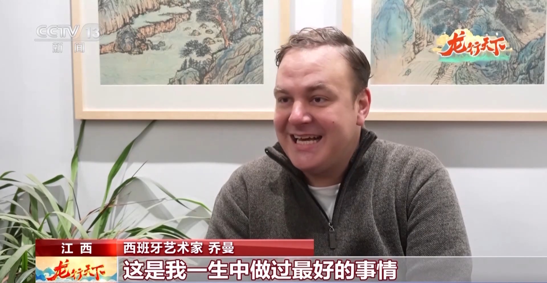 景德镇御窑博物院院长 翁彦俊:这样一个带盖的罐,明显以青花为主色,同时以这种我们的釉下彩、釉里红来去做结合。在西班牙这个可能是不太常用的材质,北宋开始的这种山水画,一看这里面也能找到痕迹。我觉得非常有意思,因为交流从来就是双向的。所以乔曼在这方面做的我觉得是蛮有代表性,本地的艺术家通过跟他的交流,也会更加理解世界上需要什么样的中国作品。