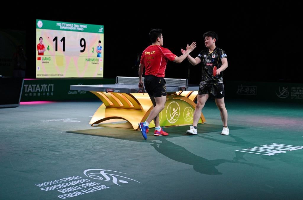 2023年5月26日,张本智和(右)与梁靖崑在比赛后相互致意。新华社记者 陶希夷 摄