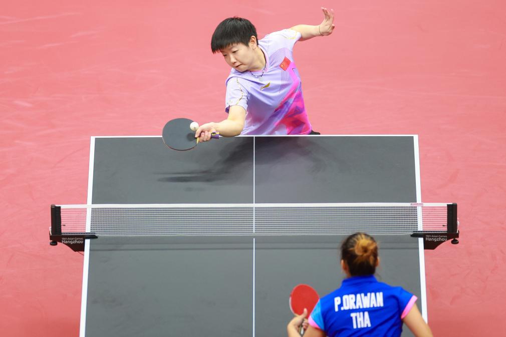 2023年9月29日,孙颖莎(上)在比赛中回球。新华社记者 刘续 摄