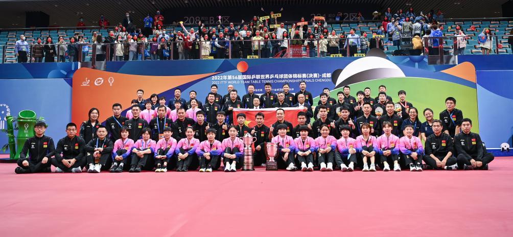 2022年10月9日,中国男、女队成员在第56届世界乒乓球团体锦标赛(决赛)颁奖仪式上与冠军奖杯合影留念。新华社记者 胥冰洁 摄