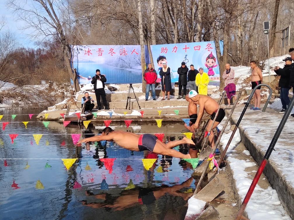 内蒙古呼伦贝尔市扎兰屯市的冬泳爱好者在进行冬泳。(温秀华摄 新华社发)