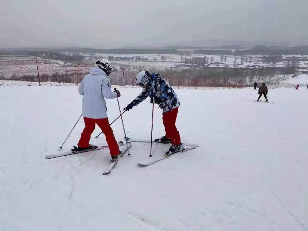 内蒙古兴安盟科尔沁右翼前旗居力很镇红心村的村民(右)作为教练正在教游客滑雪。采访者供图
