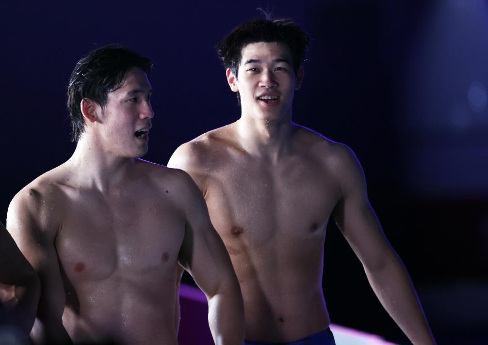 2月15日,中国选手潘展乐(右)在比赛后。新华社记者 雒圆 摄