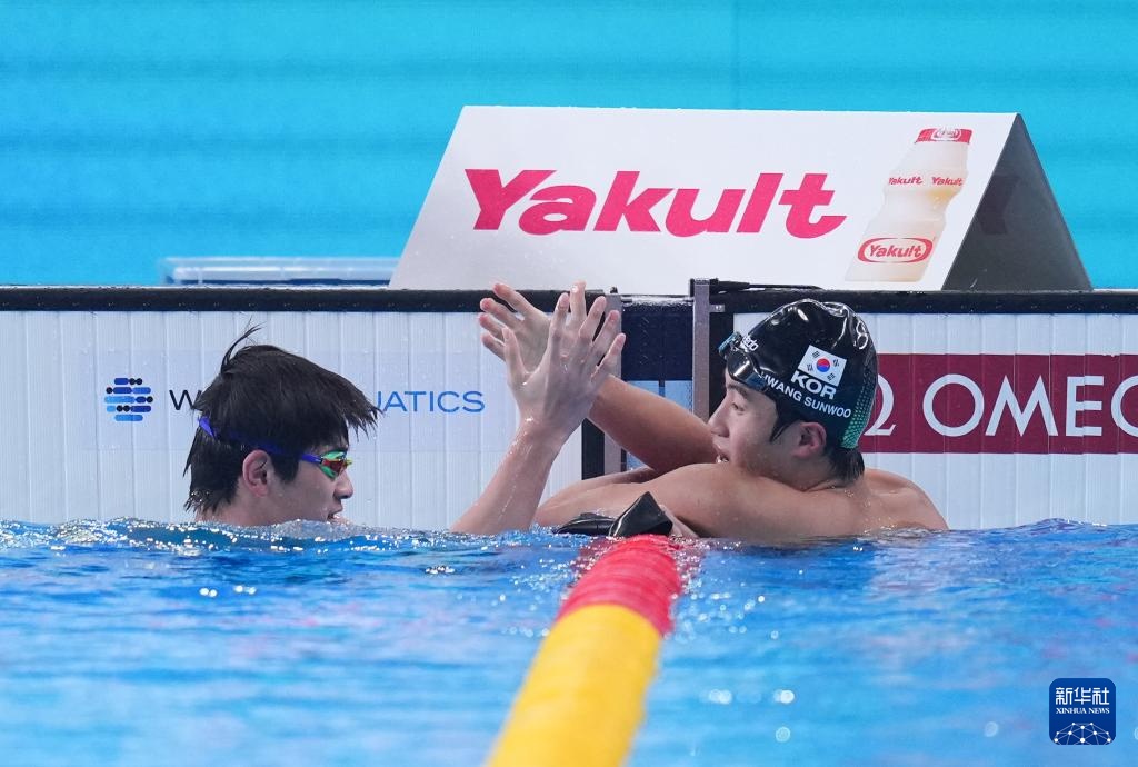 2月15日,中国选手潘展乐(左)在比赛后接受韩国选手黄宣优的祝贺。
