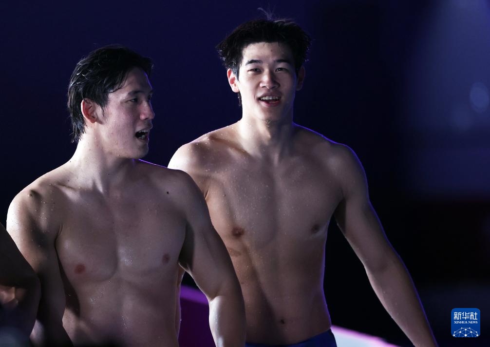 2月15日,中国选手潘展乐(右)在比赛后。