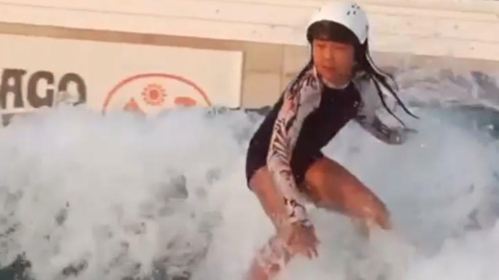 周苡竹在造浪池中进行冲浪训练