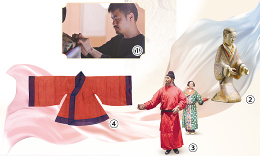 图①:陈诗宇在洛阳博物馆布展。 陈诗宇供图 图②:西汉女俑,为汉代曲裾衣考证提供参考。 西安博物院供图 图③:国家博物馆古代服饰文化展复原人像。 陈诗宇供图 图④:孔府旧藏明代朝服上衣,为明代服饰研究提供实物佐证。 山东博物馆供图 |