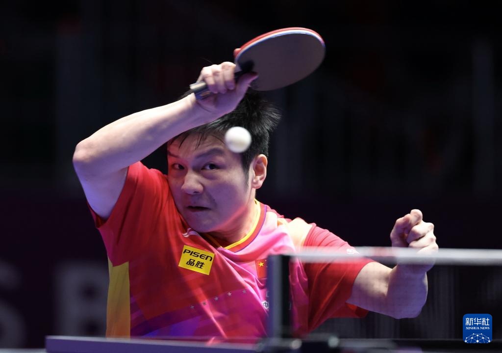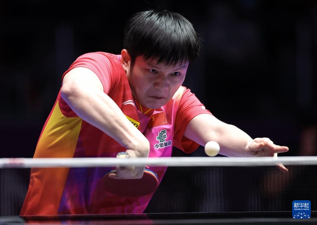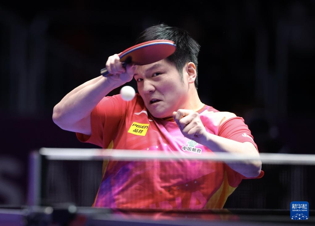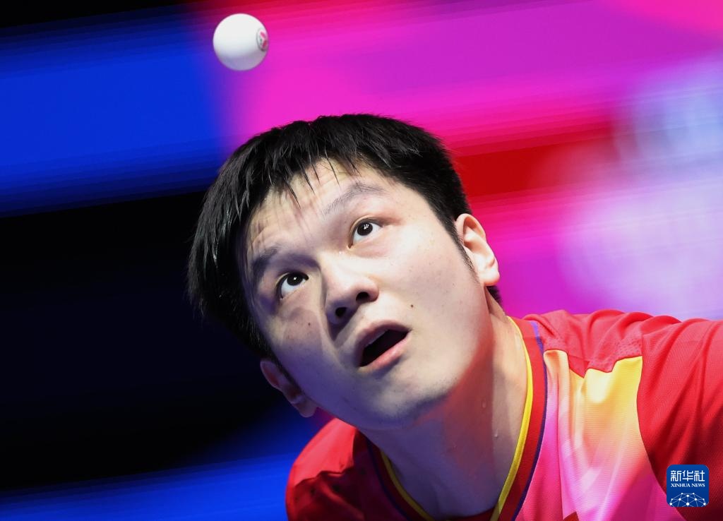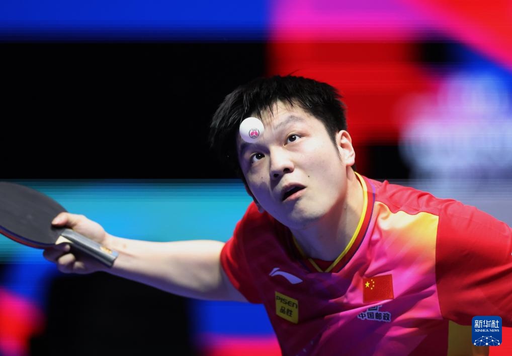 2月16日,樊振东在第一盘比赛中回球。最终,他3比0战胜比利时队选手塞德里克·努伊提克。新华社记者 杨世尧 摄