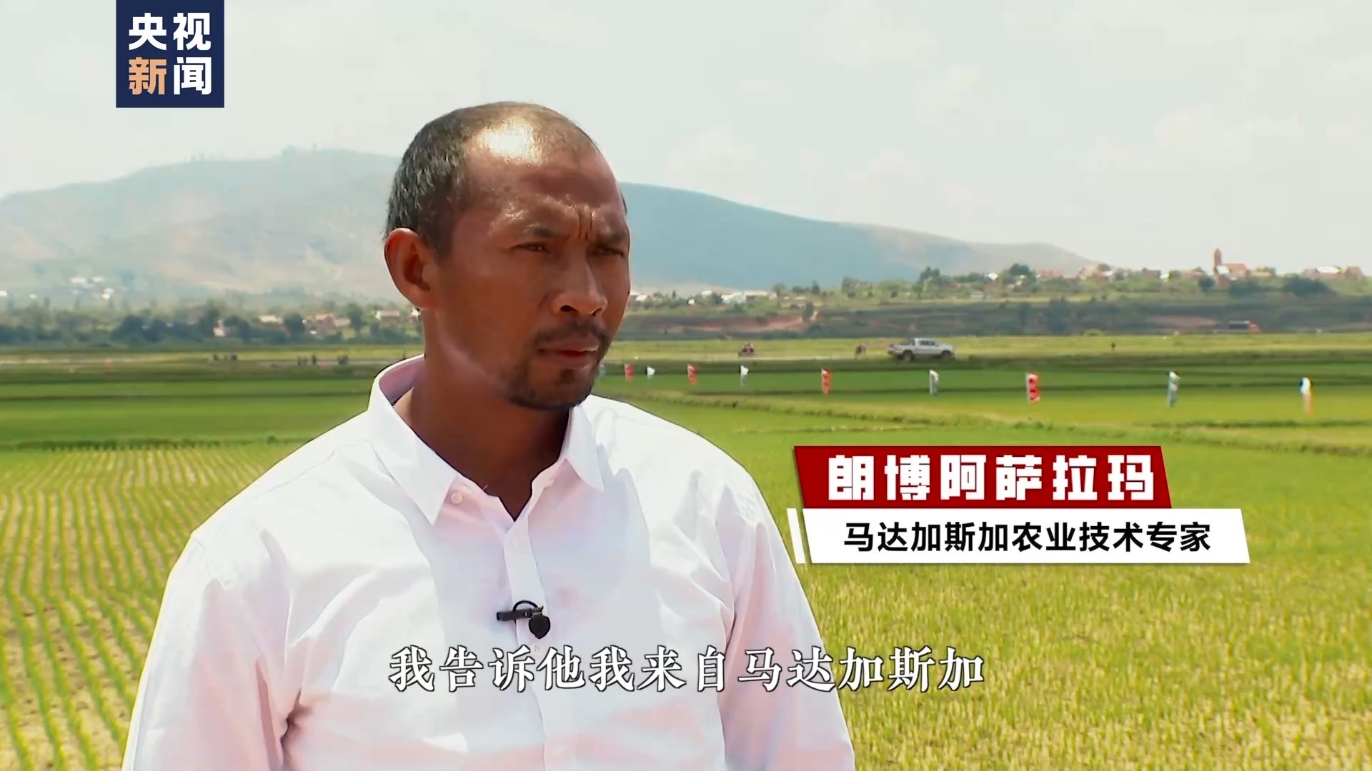 马达加斯加农业技术专家 朗博阿萨拉玛:我们来到了马义奇镇的杂交水稻稻田。现在,随着惟楚902-3杂交水稻的种植,每公顷产量超过了9吨,是此前这里产量的3倍,这让我想起了袁隆平教授,因为这些都是他工作的成果。现在我握着它们,这不是在梦里,而是在马达加斯加。