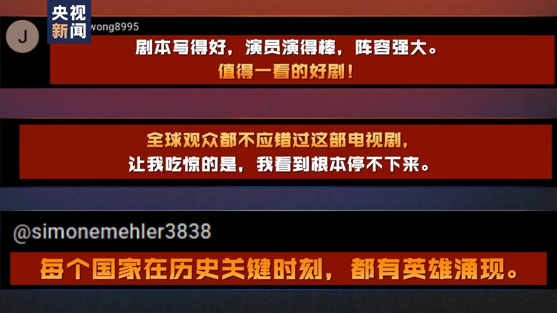 网友评价:“剧本写得好,演员演得棒,阵容强大。值得一看的好剧!” “全球观众都不应错过这部电视剧,让我吃惊的是,我看到根本停不下来。”“每个国家在历史关键时刻,都有英雄涌现。”