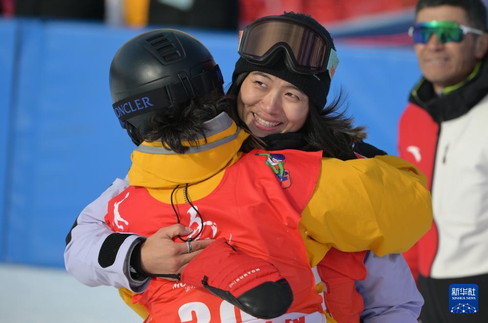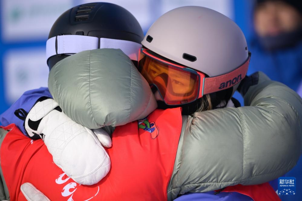 2月17日,邱冷(右)在比赛中拥抱队友武绍桐。新华社记者 贝赫 摄