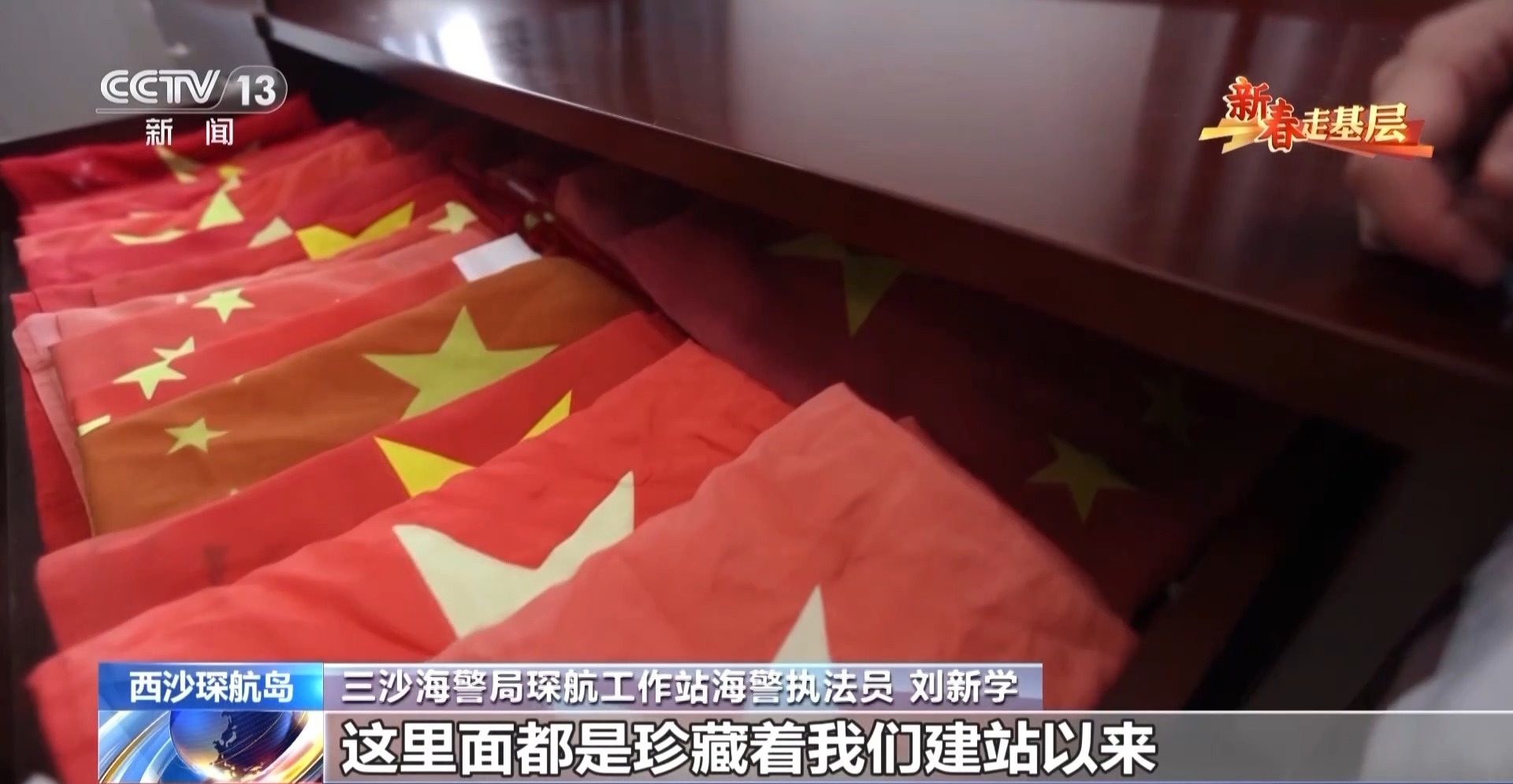 三沙海警局琛航工作站海警执法员 刘新学:这里面都是珍藏着我们建站以来,换下来的所有执法艇上的国旗。破损最严重的话,可能旗帜就剩大半面了。因为我们西沙地区这边是高温、高湿、高盐、高腐蚀,风也比较大,所以国旗边角就比较容易破损。