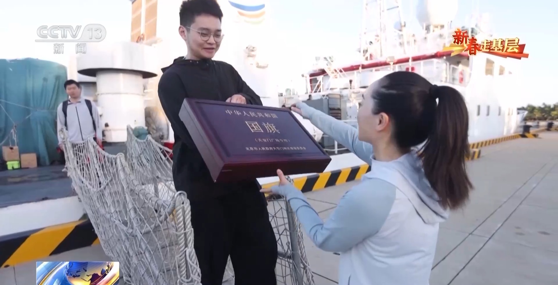 建站4年更换下的26面国旗,见证着海警队员们的日夜坚守。在即将离开琛航岛的时候,我们向天安门地区管理委员会申请的曾在天安门广场升起过的国旗送到了琛航岛,这是我们《新春走基层》记者想要送给海警队员们的一份特别礼物。
