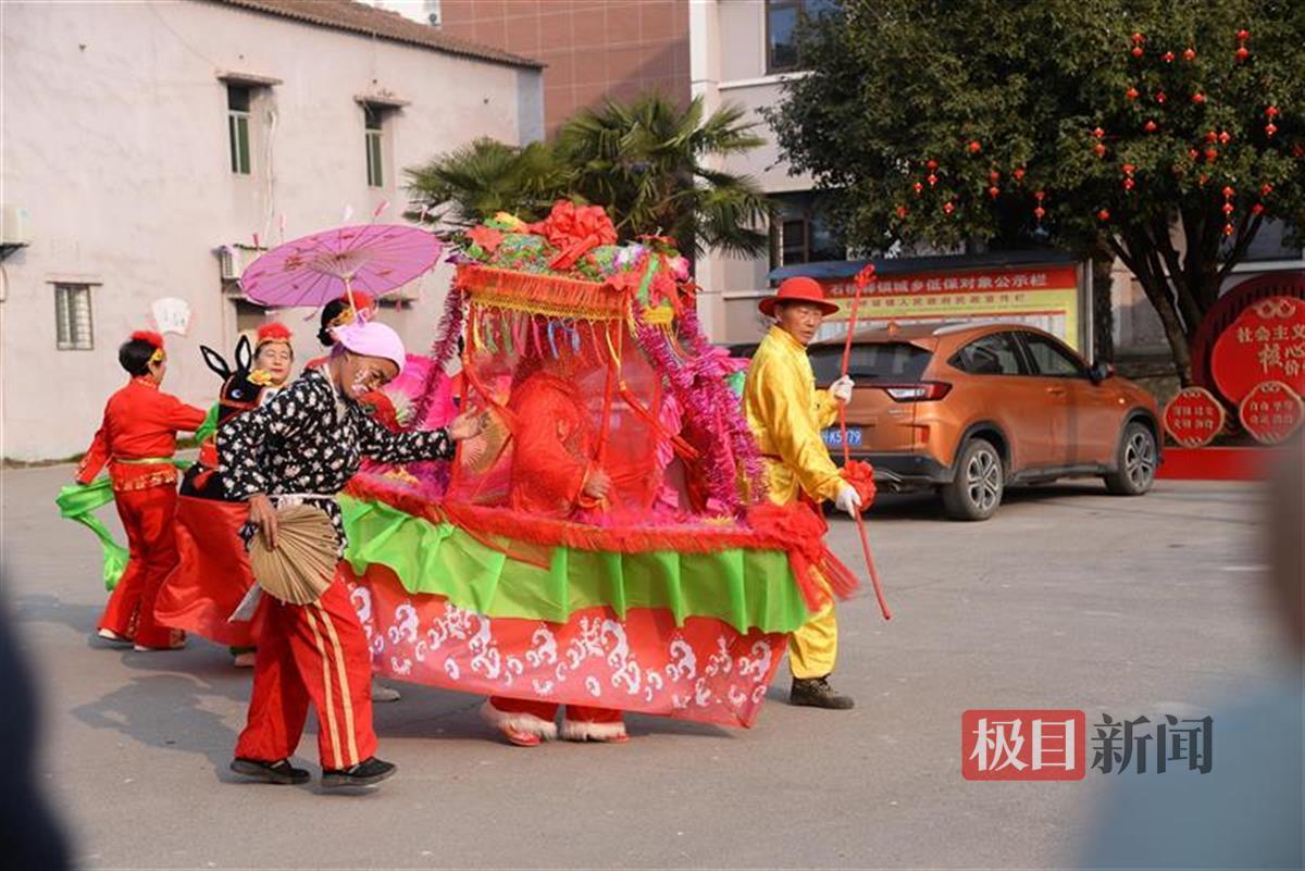 “咚咚锵!咚咚锵!采莲船呐,两头尖呐啊嘿嘿,来给各位拜新年呐!”2月17日,农历正月初八,荆门市东宝区石桥驿镇河垱村文体娱乐队在盐池街道表演“采莲船”,为街道两旁住户送来新年祝福。