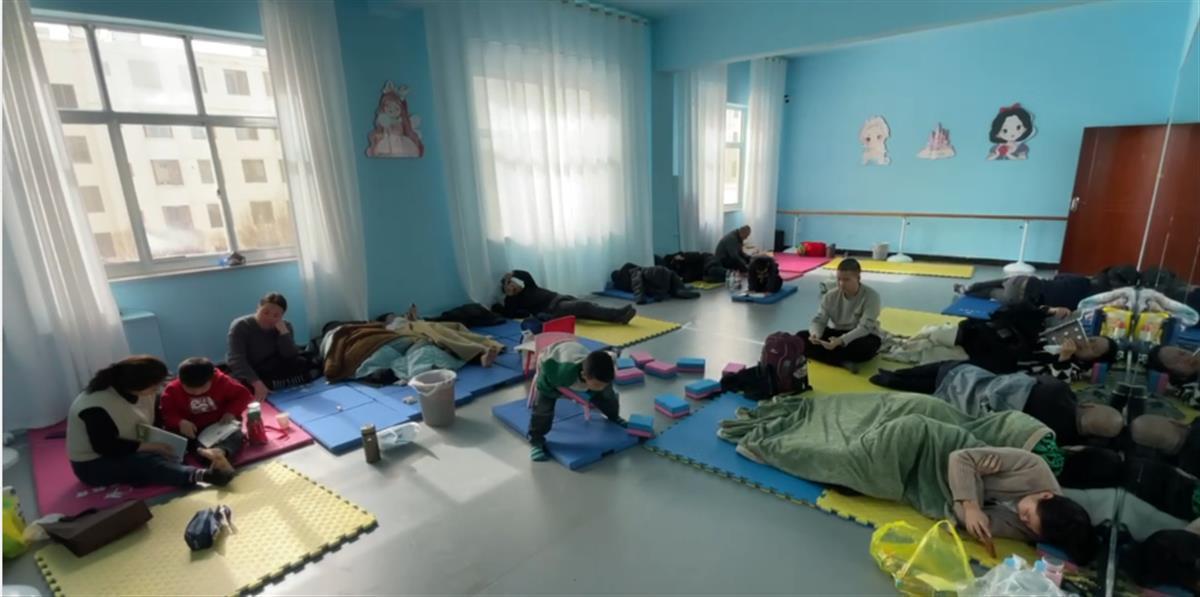 “我们有垫子和地暖,瑜伽砖可以当枕头。”关先生称,自己当即决定开放498平方米的舞蹈教室给滞留旅客休息。关先生提供的视频显示,很多滞留人员睡在用泡沫垫拼起来的临时床垫上,有些大人和孩子挤在毯子里,有的人则直接和衣而睡。“外面零下15℃,因为有地暖,室温有24℃,住得还算暖和。”关先生说,他一直忙到凌晨2点,晚上就睡在培训学校办公室里。
