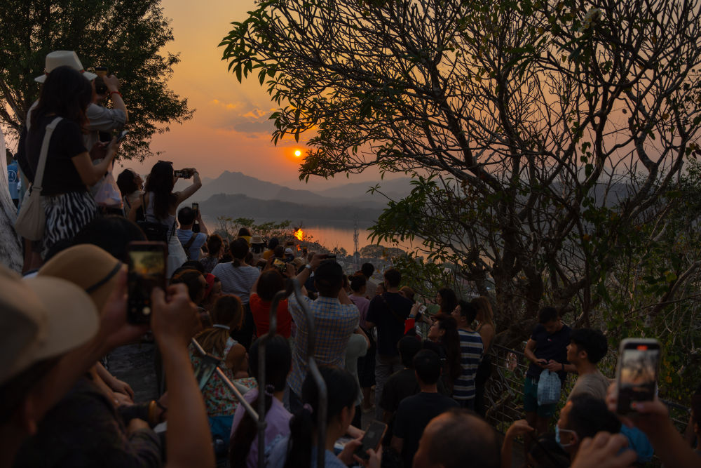 2月16日,在老挝琅勃拉邦普西山山顶,游客在观赏落日景观。湄公河畔、老挝北部群山环绕的琅勃拉邦在14到16世纪间曾是老挝历史上第一个统一的多民族国家澜沧王国的首都。琅勃拉邦古城1995年被联合国教科文组织列入世界文化遗产,如今已经成为老挝历史与文化的象征。