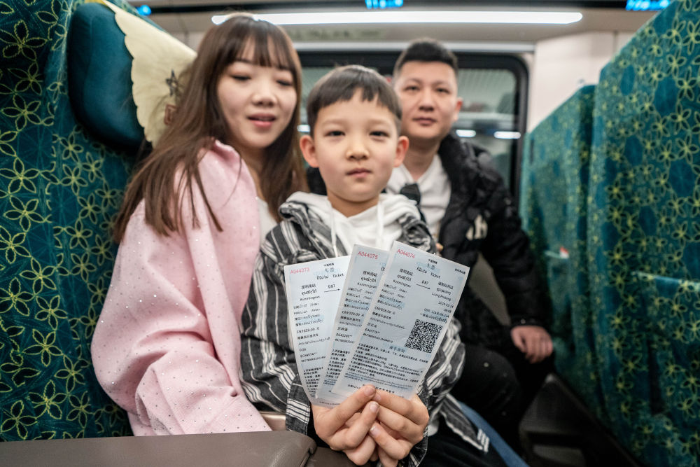 2月14日,乘坐中老铁路国际旅客列车前往老挝的游客展示购买到的车票。