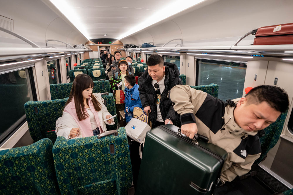 2月14日,游客在昆明南站乘坐中老铁路国际旅客列车准备前往老挝旅游。