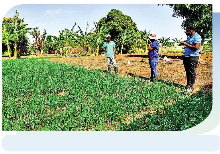 在莫桑比克马普托省博阿内地区,两名中莫农业技术示范中心技术员与当地农民(左)交流。新华社记者 董江辉摄