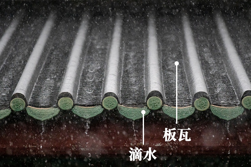 下雨天时,雨水从筒瓦顺势流到板瓦上