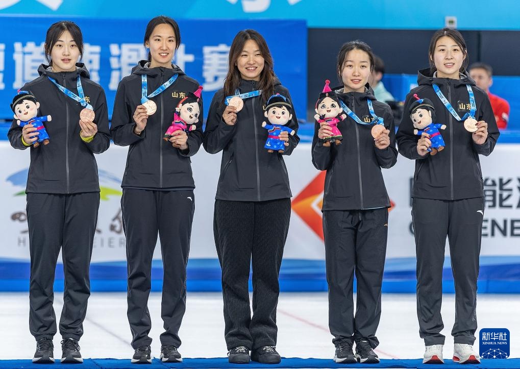 2月18日,山东队在颁奖仪式上展示奖牌。新华社记者 黄伟 摄
