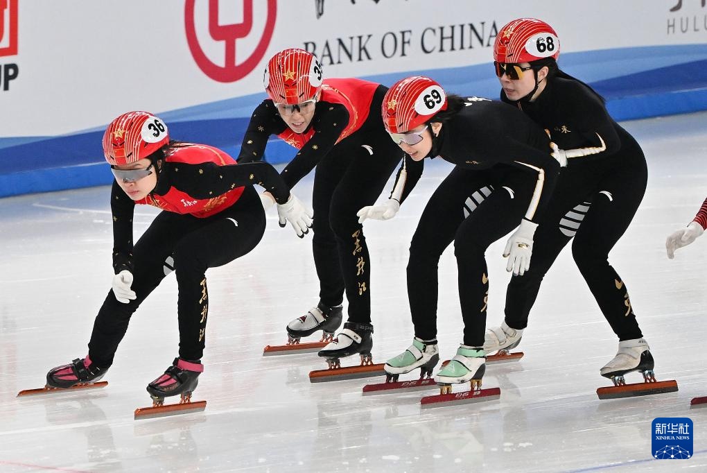 2月18日,黑龙江队选手范可新(左二)和队友徐爱丽(左一)、山东队选手公俐(右一)和队友李璇在比赛中接力。新华社记者 胥冰洁 摄