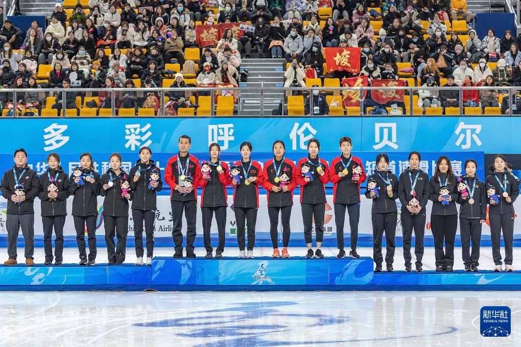 当日,第十四届全国冬季运动会短道速滑(公开组)女子3000米接力决赛在内蒙古呼伦贝尔市海拉尔区内蒙古冰上运动训练中心短道速滑馆举行,黑龙江队以4分13秒075的成绩获得冠军,辽宁队和山东队分获亚军和季军。