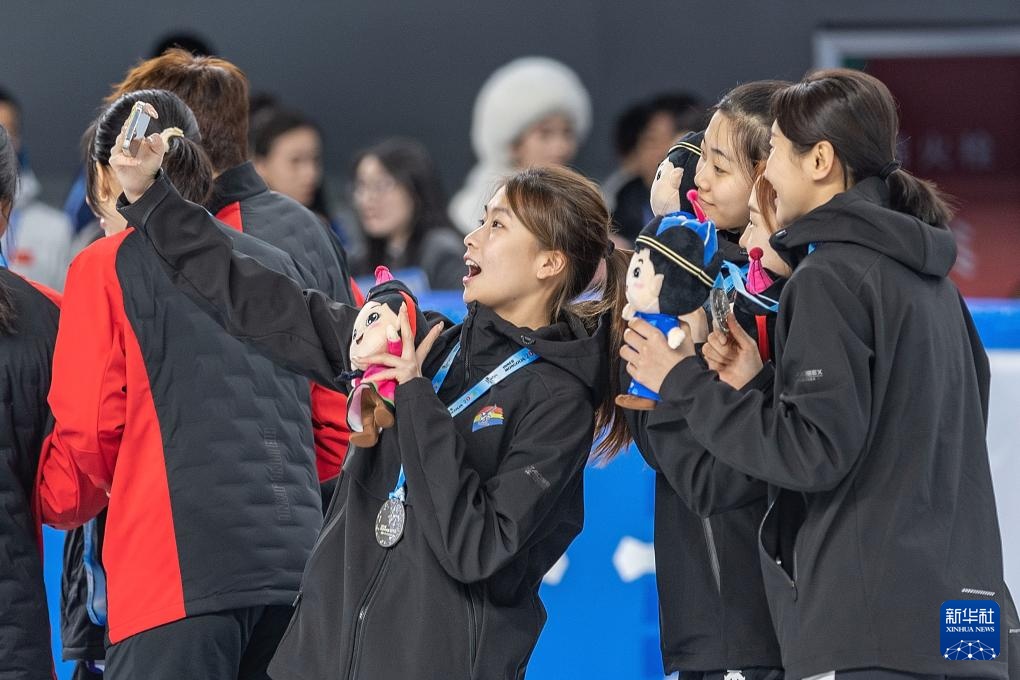 2月18日,黑龙江队选手徐爱丽(左一)、臧一泽(左二)、范可新(右二)、王欣然在夺冠后向观众致意。新华社记者 黄伟 摄