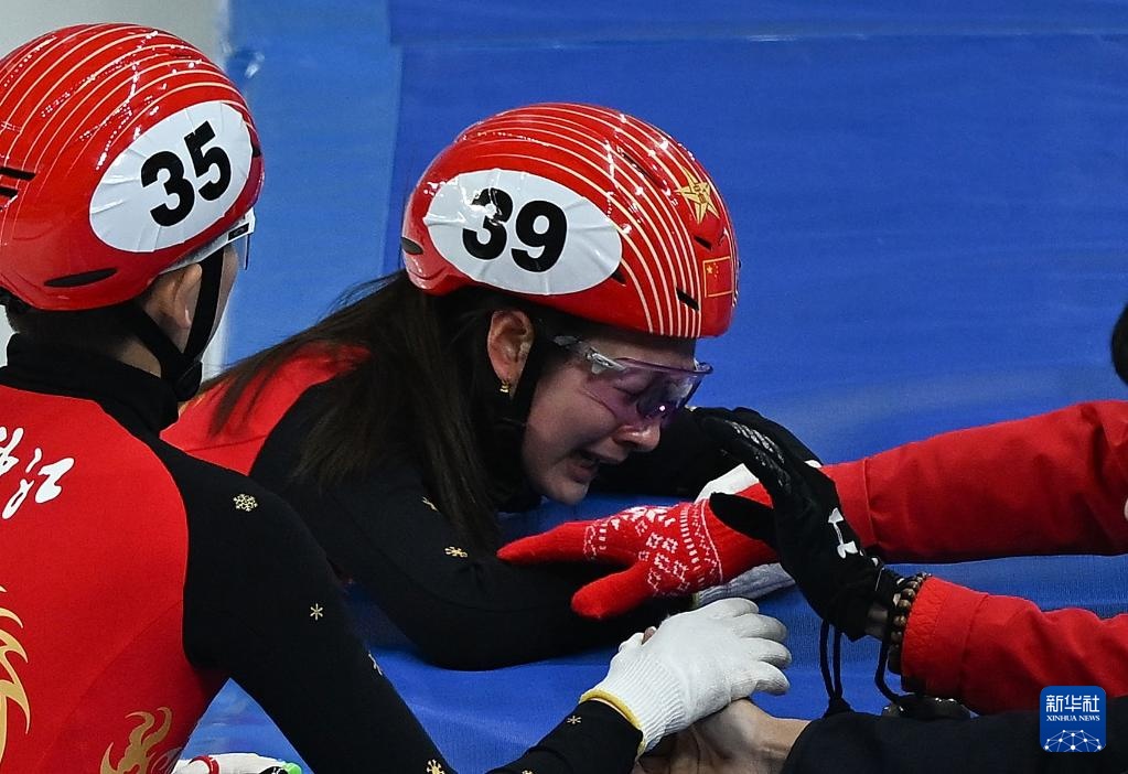 2月18日,黑龙江队选手王欣然(中)在赛后激动落泪。新华社记者 连振 摄