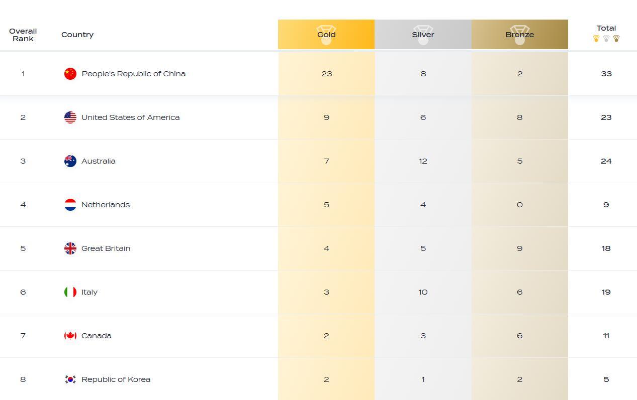中新网北京2月19日电 随着游泳比赛战罢,2024多哈游泳世锦赛于北京时间19日凌晨收官。在总金牌榜上,收获23金的中国队断层占据榜首。总奖牌榜,中国队以33枚的成绩同样位居第一。
