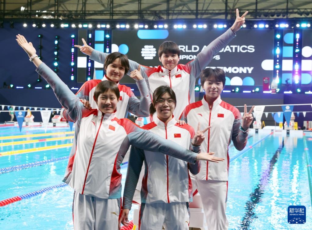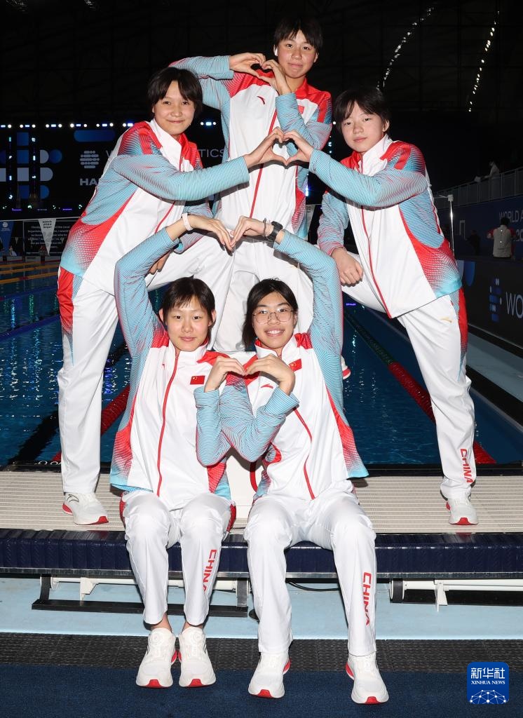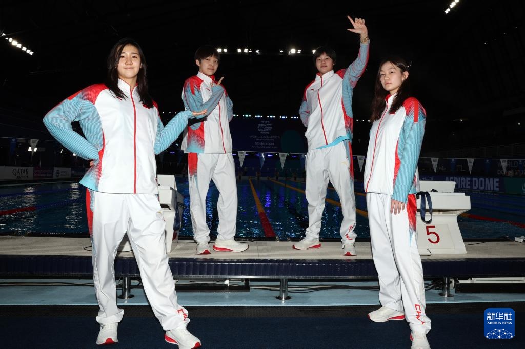 当日,卡塔尔多哈举行的2024年世界游泳锦标赛游泳项目进入最后一个比赛日。中国游泳队部分成员在收官日拍照留念。