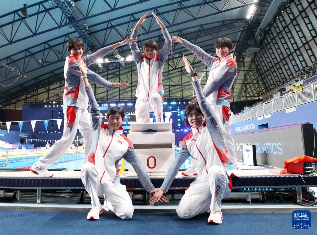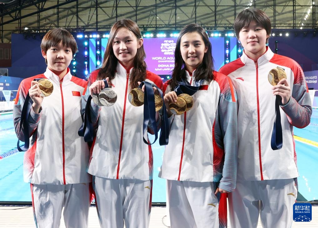2月18日,中国游泳队成员马永慧、李冰洁、艾衍含、杨佩琪(从左至右)持奖牌留影。新华社记者 雒圆 摄