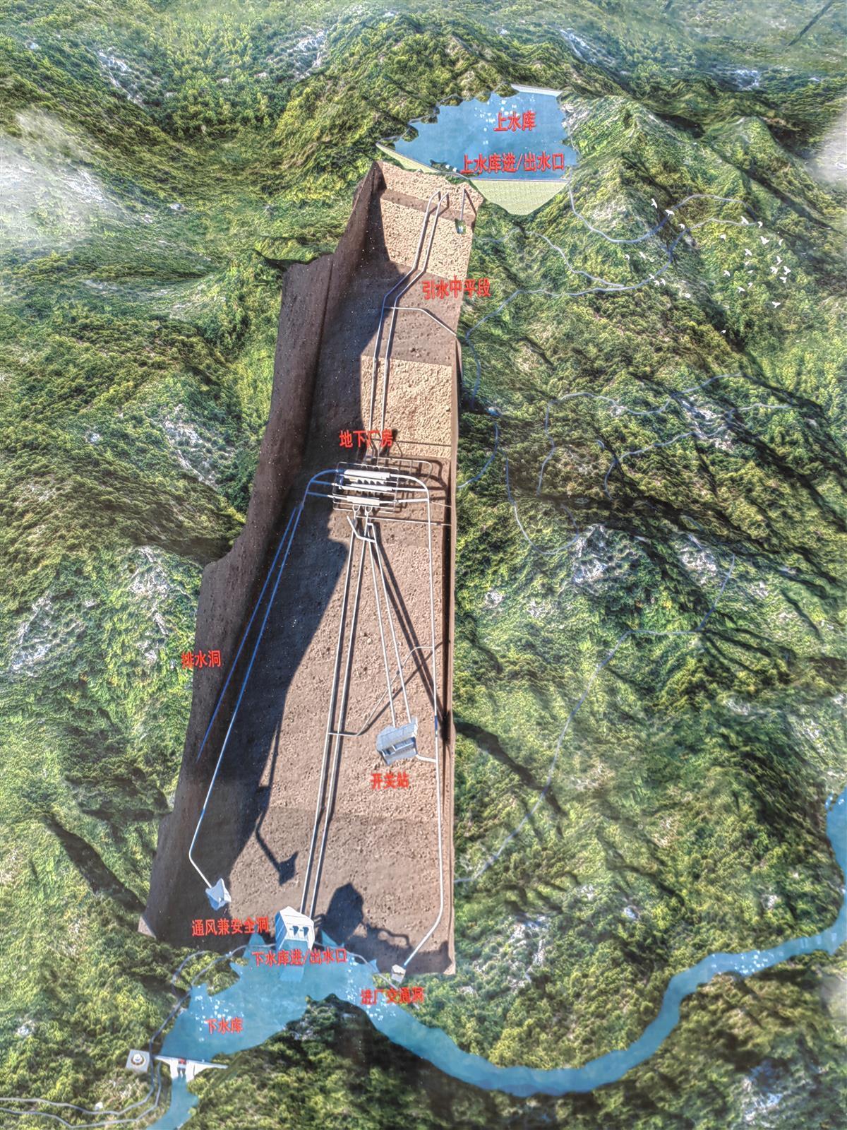 为连通上下水库,需要在山体里修建1条2.3公里的引水隧道,由平段和斜井组成,呈折线状,宛如一座山体里的“溜滑梯”。