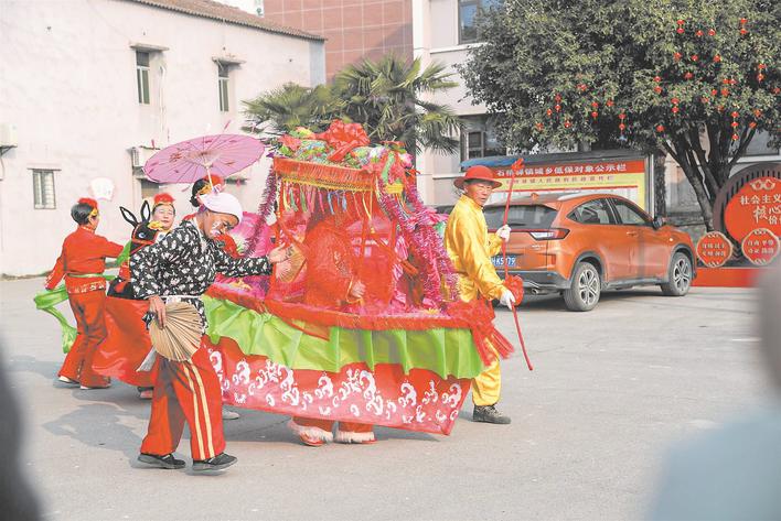 楚天都市报极目新闻讯(记者高伟 通讯员彭亚昕 罗双玉)“咚咚锵!咚咚锵!采莲船啦,两头尖啦啊嘿嘿,来给各位拜新年啦!”2月17日,农历正月初八,荆门市东宝区石桥驿镇河垱村文体娱乐队在盐池街道表演“采莲船”,为街道两旁住户送来新年祝福。