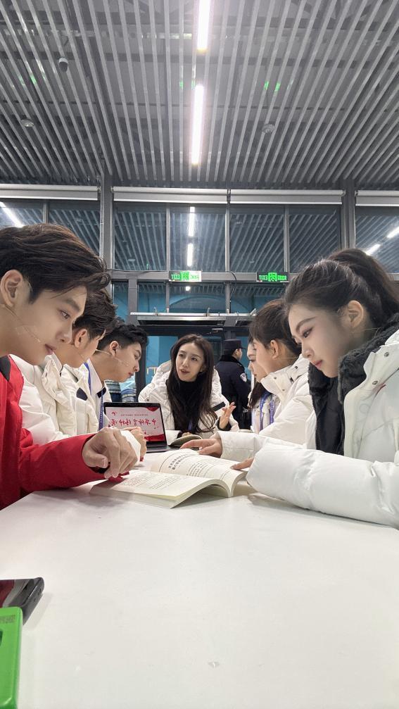 除了练习朗诵,还要练习舞台走位,但由于彩排场地有限,学生们需要在户外练习。面对零下二三十摄氏度的低温,他们没有退缩。“朗诵词中有一句‘顽强拼搏,彰显新时代的风采昂扬’,我们是这么说的,也要这么做。”黄泽宇说。