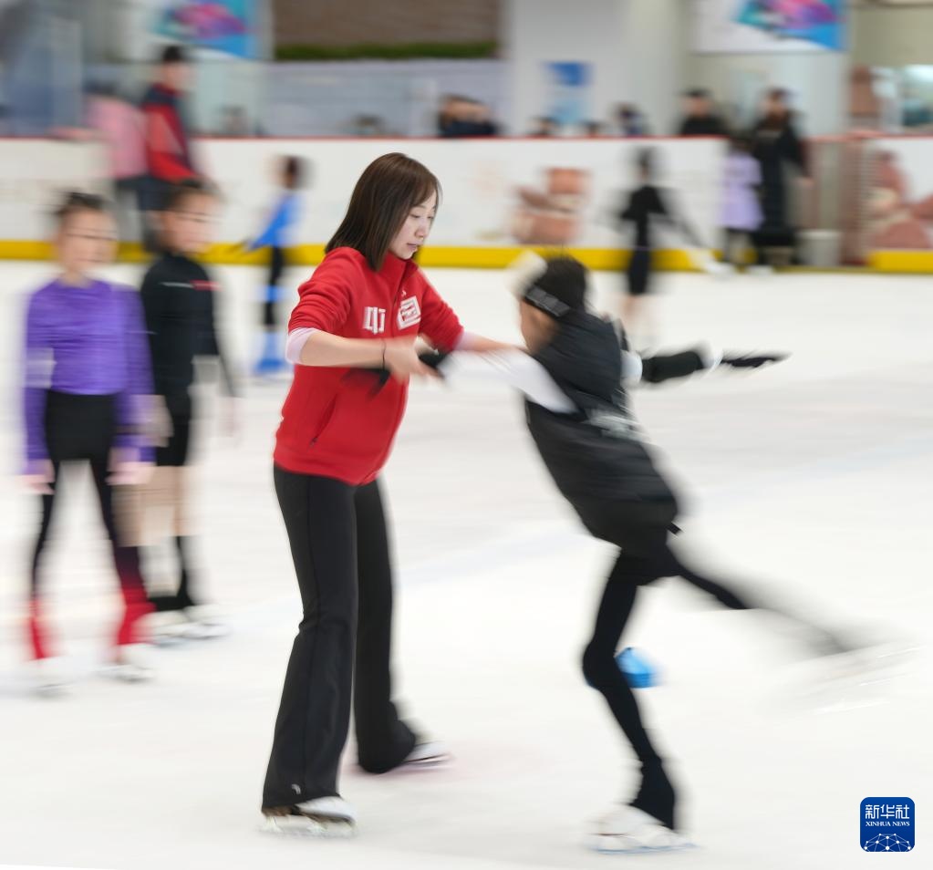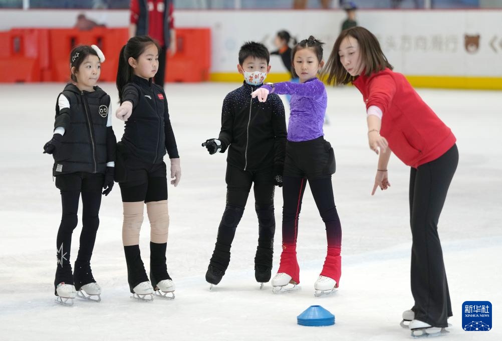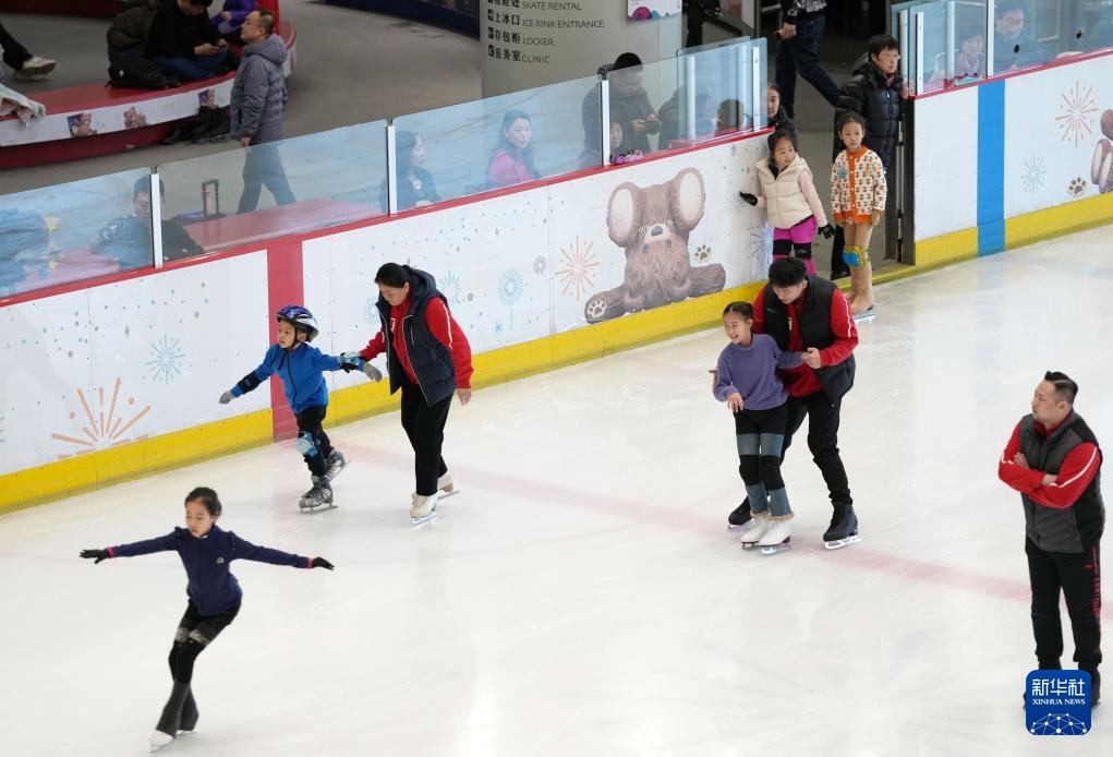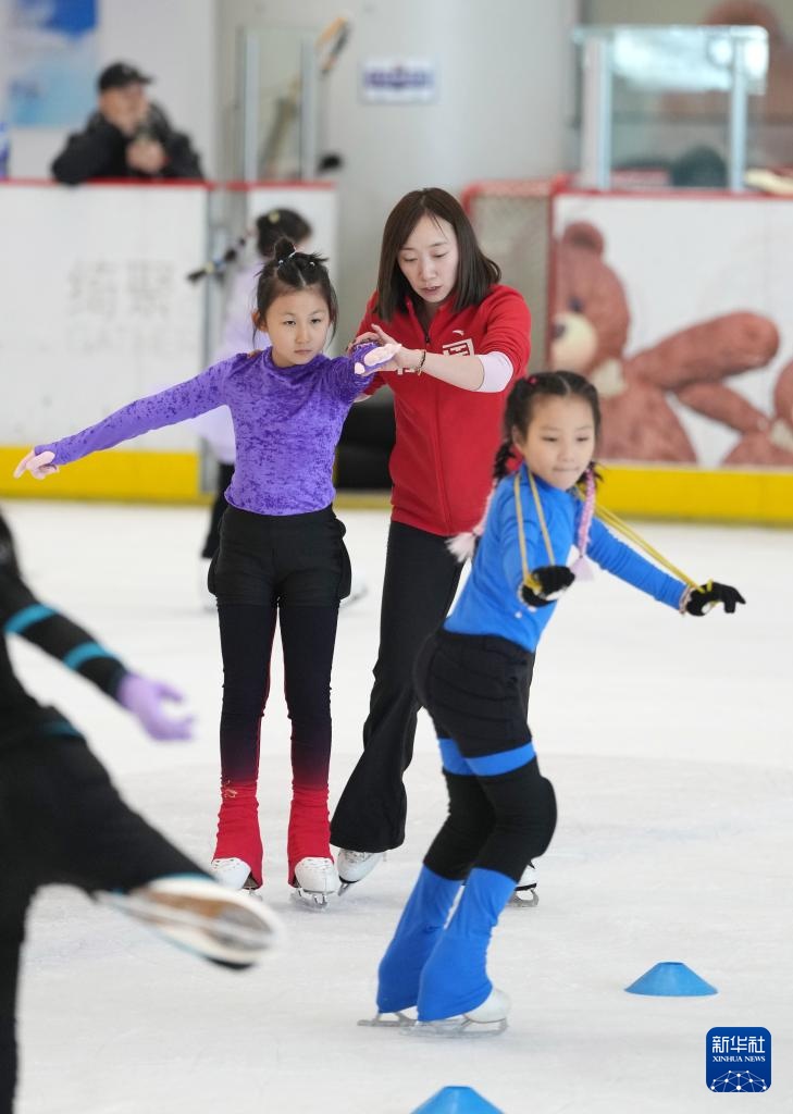 这是2月19日,一名冰场教练员(右一)在沈阳冰纷万象滑冰场指导小学员滑冰技术。新华社记者 李钢 摄