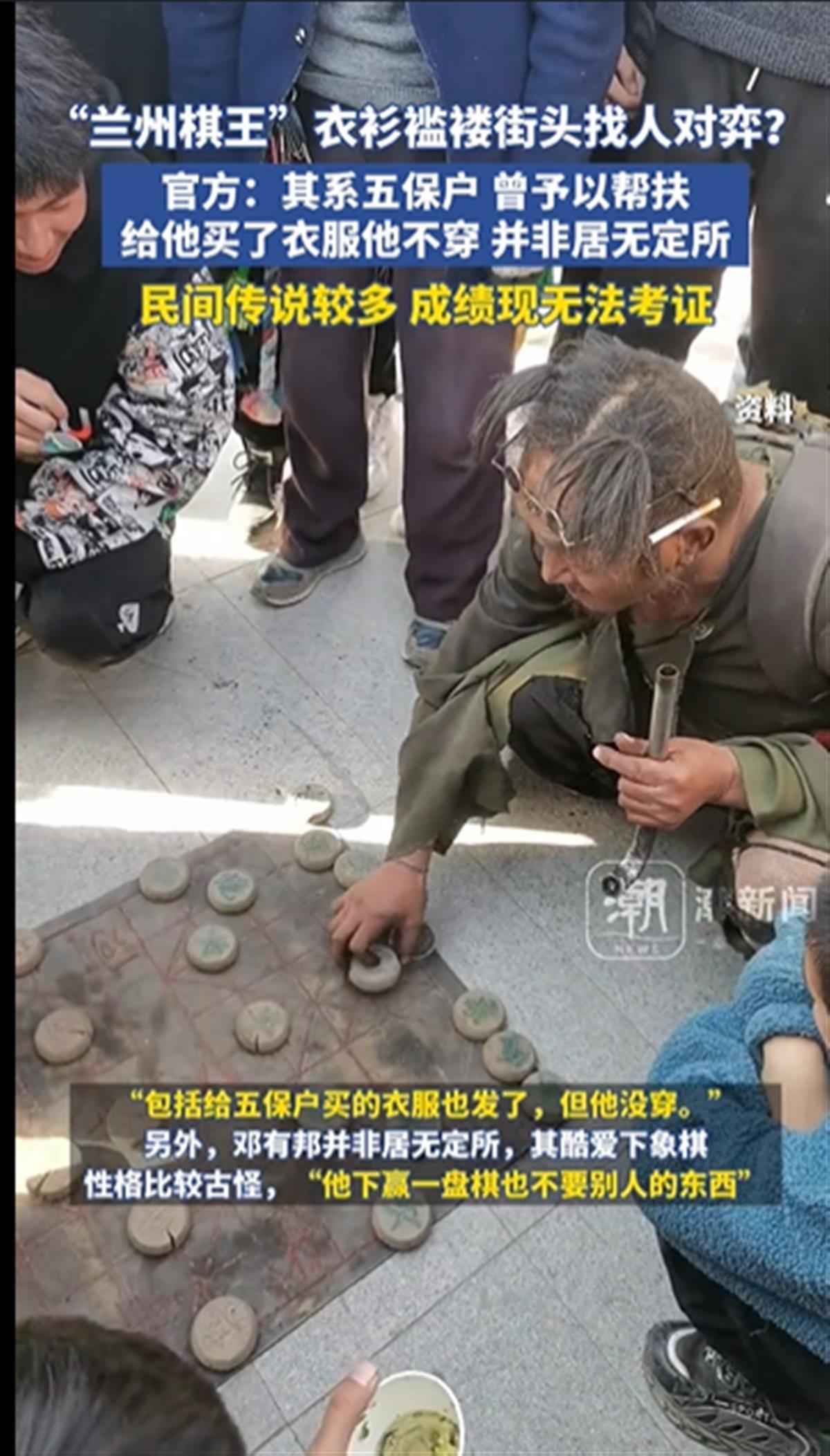 近日,网友发布的“兰州棋王”邓有邦相关视频在网上热传,有网友称其是流浪乞讨人员,还有网友称其曾是世界冠军且身价不菲。2月19日,兰州新区秦川园区民政和社保局工作人员向记者证实,邓有邦是当地的分散特困供养对象,相关部门对其的帮扶措施已经落实到位。关于邓有邦曾取得的成绩,民间传说比较多,现在无法考证。(据2月19日极目新闻)