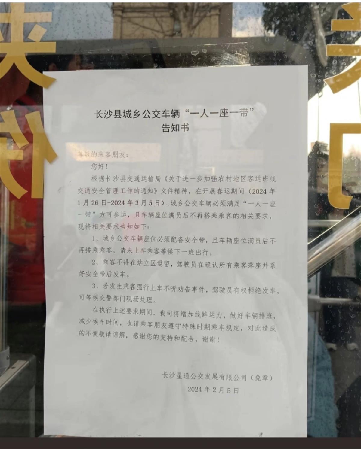 根据网友发布的一张《长沙县城乡公交车辆“一人一座一带”告知书》,根据长沙县交通运输局的通知精神,在春运期间,城乡公交车必须满足“一人一座一带”方可参运,且车辆座位满员后不允许再搭乘乘客。