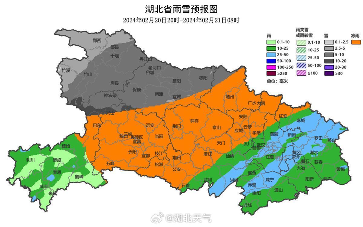 今晚(20日)8时至明早(21日)8时,十堰、襄阳、神农架、随州西部雨夹雪、冰粒或冻雨转中到大雪,局部暴雪;宜昌、恩施北部、荆门、随州东部、孝感、荆州西部、天门、潜江、武汉西部中雨转冻雨或冰粒;其他地区中到大雨,黄冈、武汉、鄂州、咸宁、黄石局部暴雨并伴有短时强降水、雷暴大风、冰雹等强对流天气。最高气温北部2℃-6℃、南部7℃-10℃,最低气温北部-4至0℃、南部1℃-5℃。偏北风4到6级、阵风7到10级。