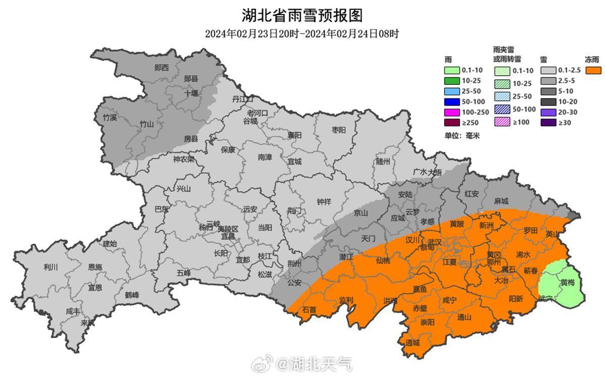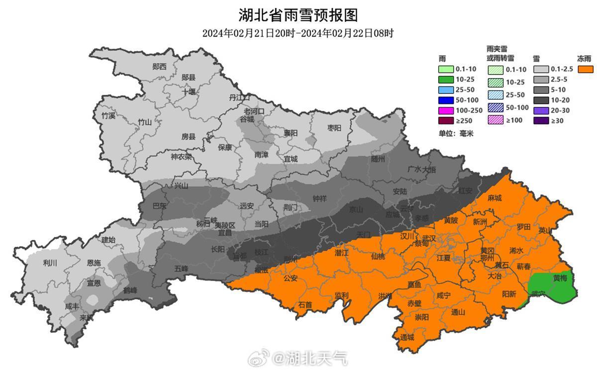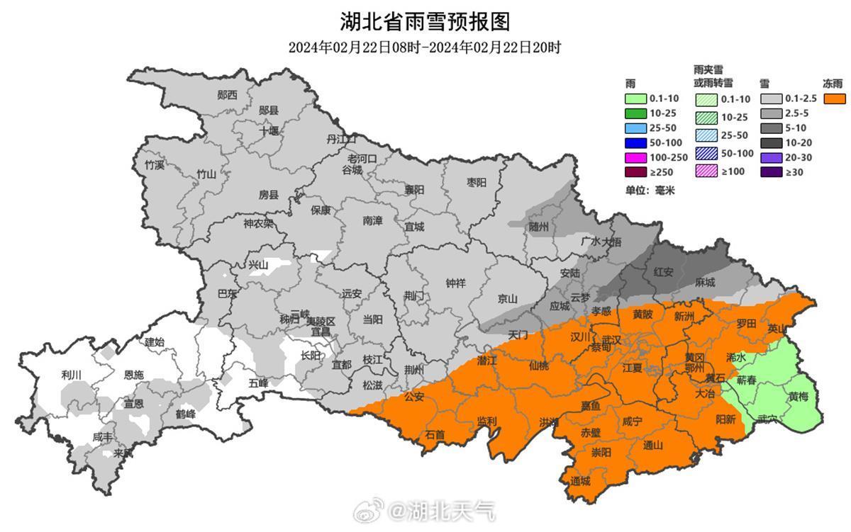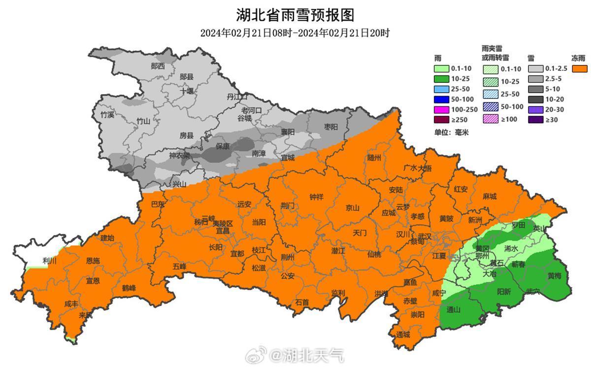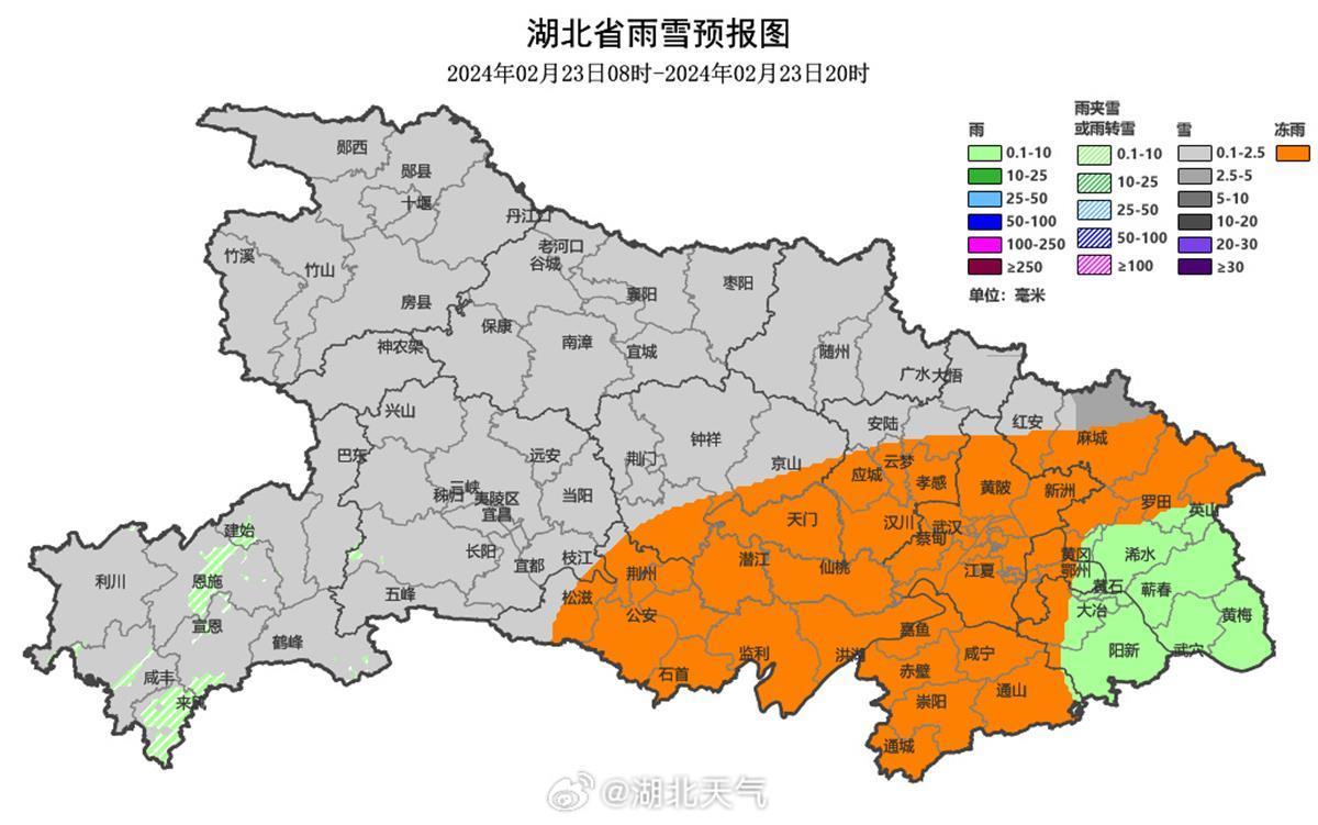 湖北各地的雨雪冰冻发展进程,详情如下,看看自己所在的城市是雪、冰粒还是冻雨: