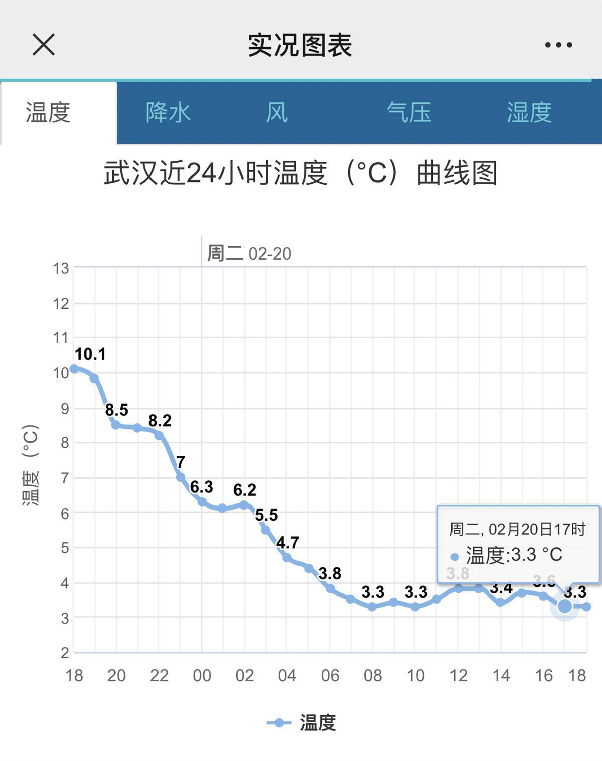武汉今日(20日)17时仅3.3℃