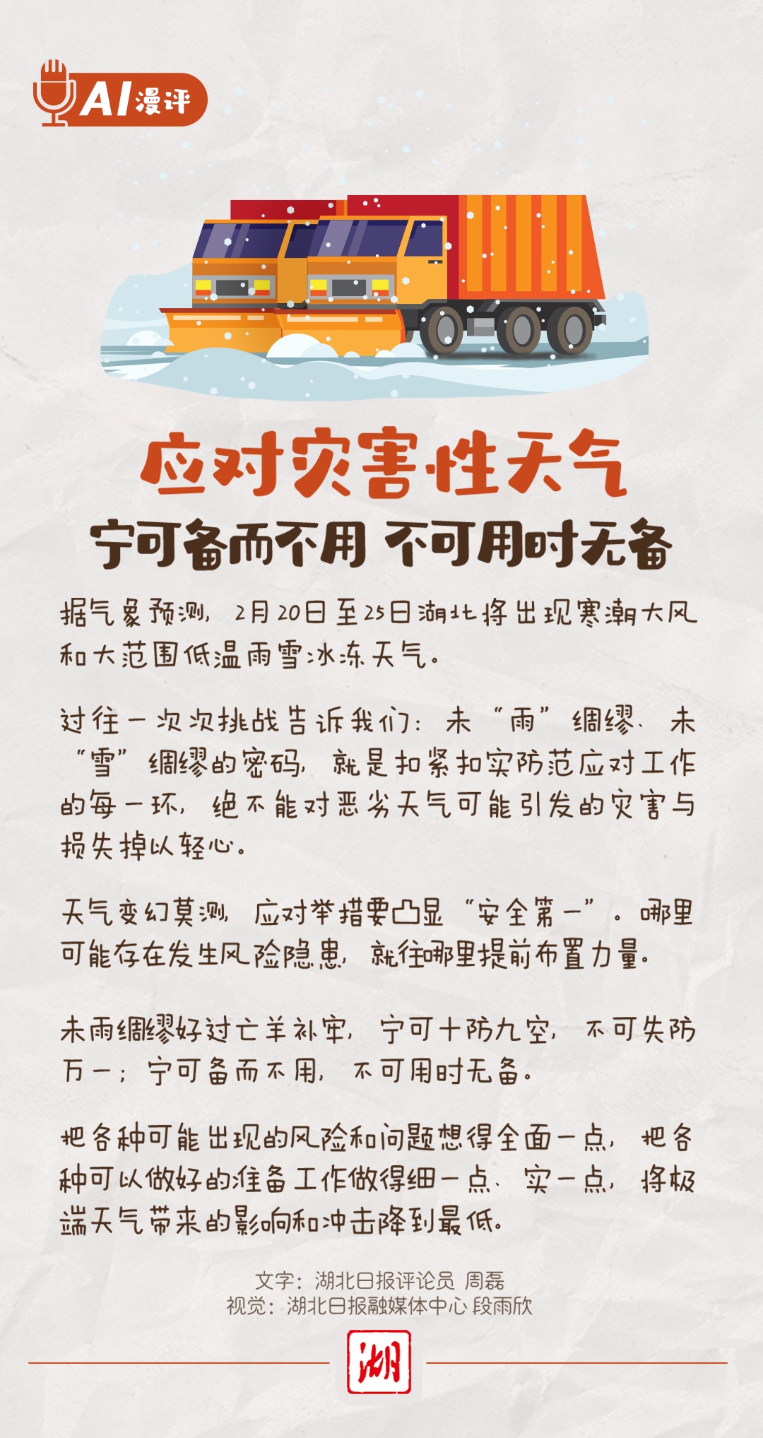 复杂天气状况,对防寒、防灾应急预案提出了更高的要求。极端天气给生产生活造成的影响是实实在在,各项应对防范工作只有思虑在前、准备充分、做得扎实,关键时刻才能掌握更多主动权。过往一次次挑战告诉我们:未“雨”绸缪、未“雪”绸缪的密码,就是扣紧扣实防范应对工作的每一环,绝不能对恶劣天气可能引发的灾害与损失掉以轻心。
