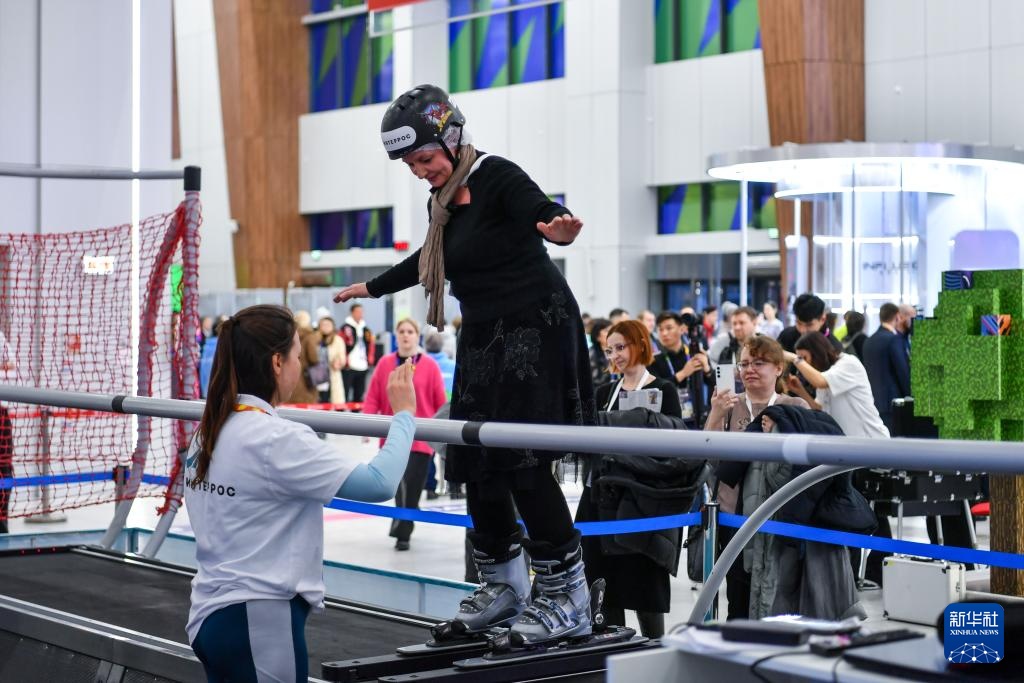 2月21日,一位女士体验“未来运动会”的展示项目。新华社记者 曹阳 摄