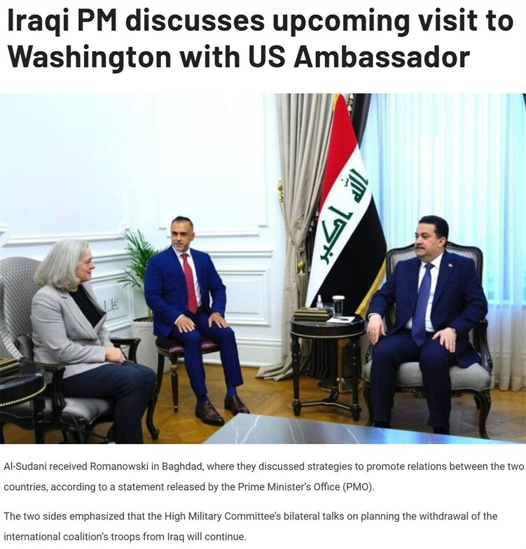 此前一天,苏达尼表示,伊拉克政府已收到来自美国驻伊拉克使馆的一封正式信函,同意协调结束以美国为首的国际联盟在伊拉克境内任务的时间表。苏达尼重申,伊拉克政府拒绝该国成为各方冲突的平台。