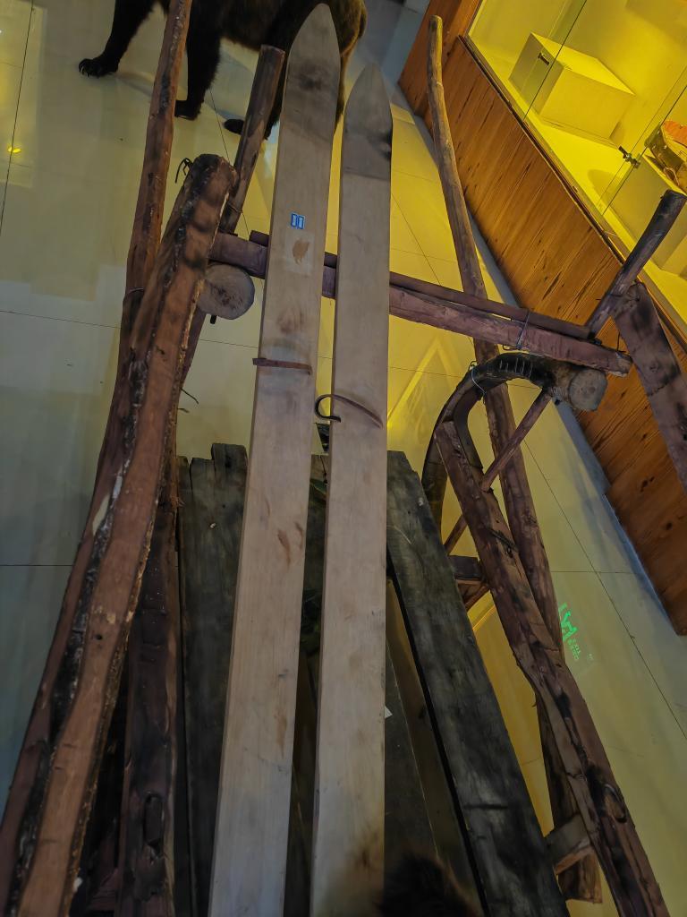 鄂伦春民俗博物馆中展出的滑雪板。新华社记者 刘博 摄